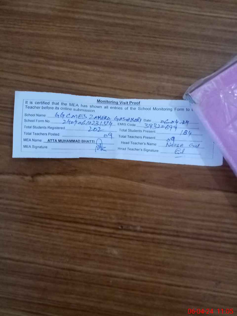 | Attendance Register | Head Teacher | MEA with School | Visit Proof |