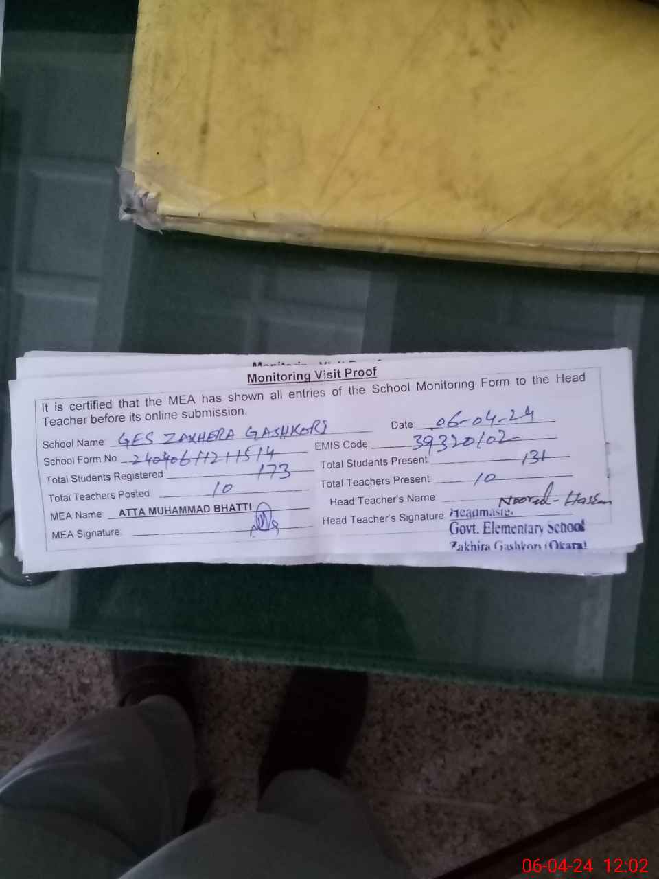 | Attendance Register | Head Teacher | MEA with School | Visit Proof |