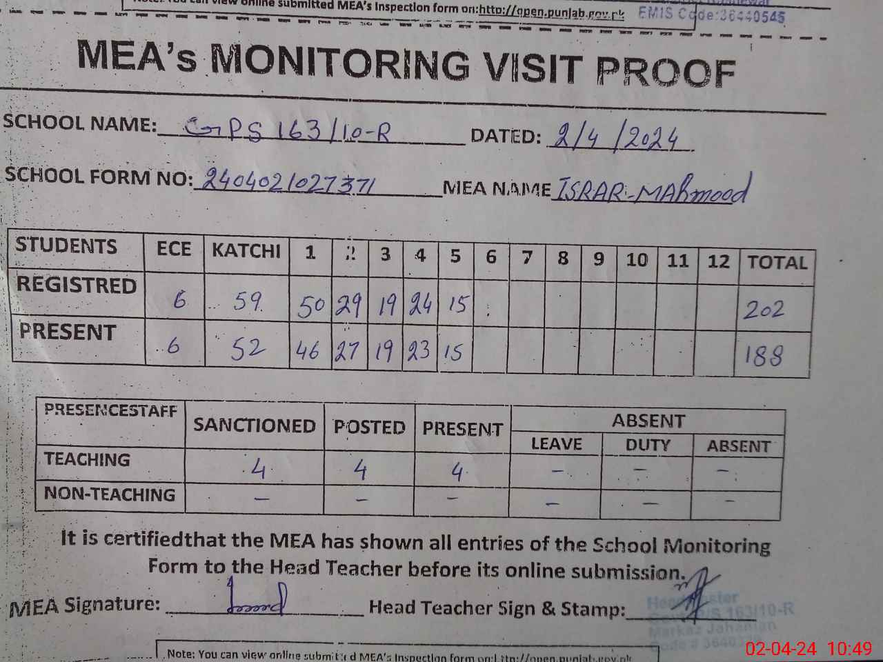 | Certified that this School was Inspected by the Undersigned MEA/DMO Today and the Information Stated Above is as Per Record. | |||||