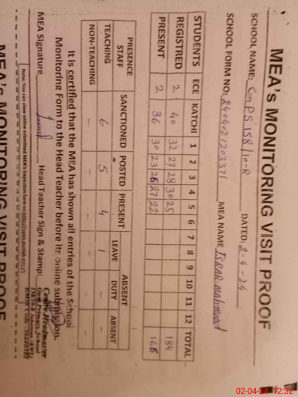 | Attendance Register | Head Teacher | MEA with School | Visit Proof |
