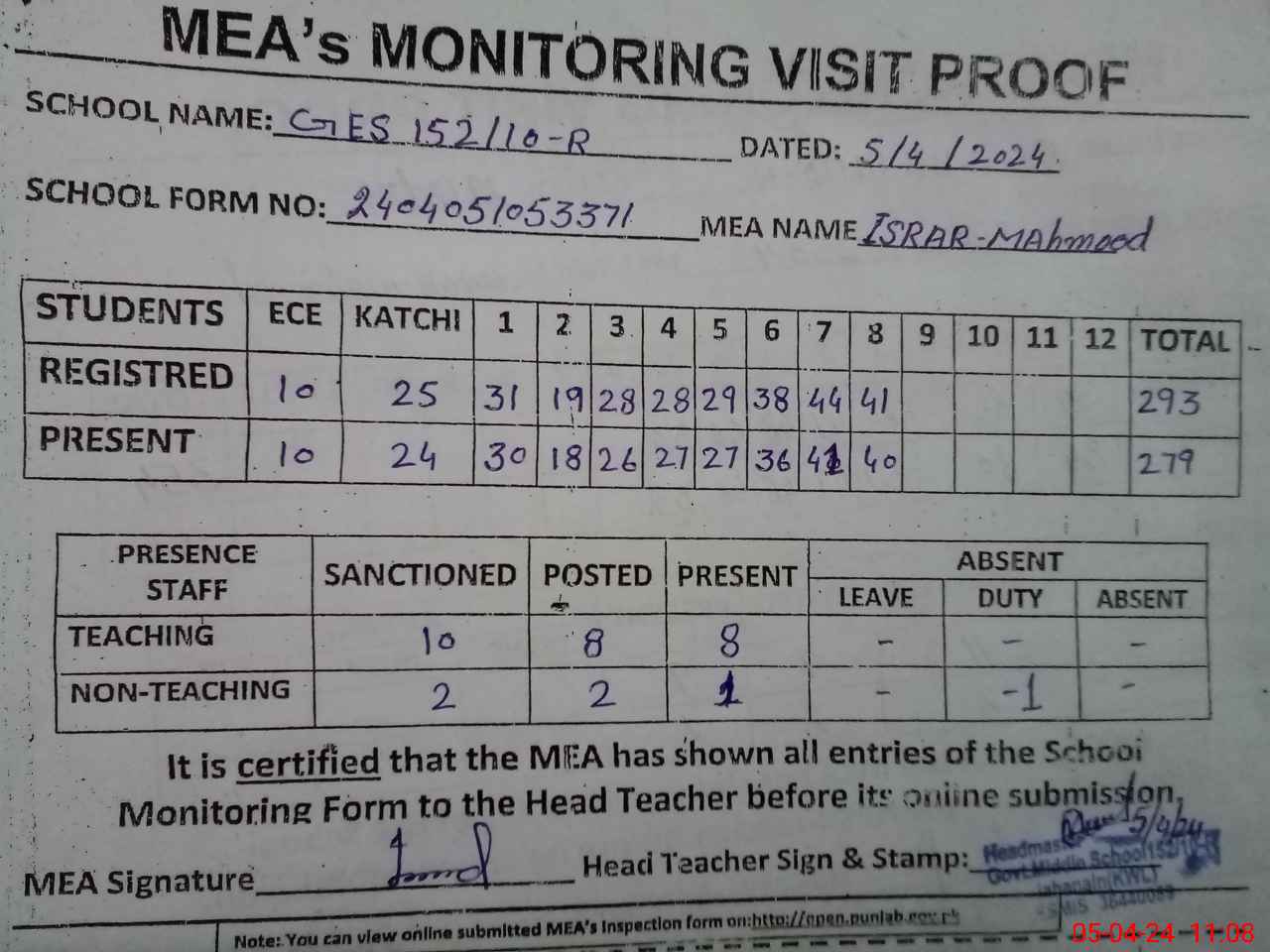| Attendance Register | Head Teacher | MEA with School | Visit Proof |