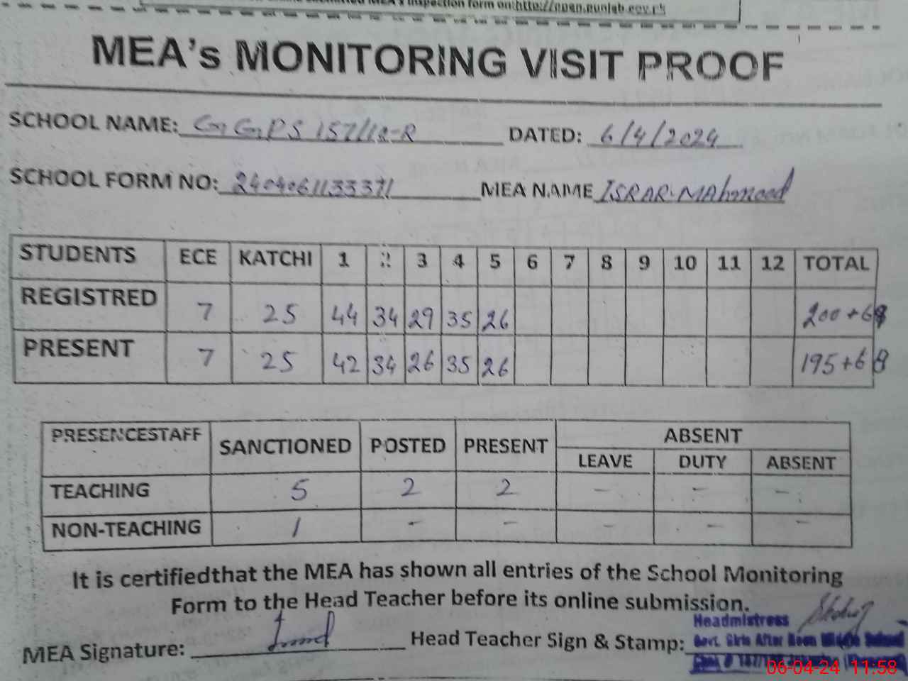 | Attendance Register | Head Teacher | MEA with School | Visit Proof |