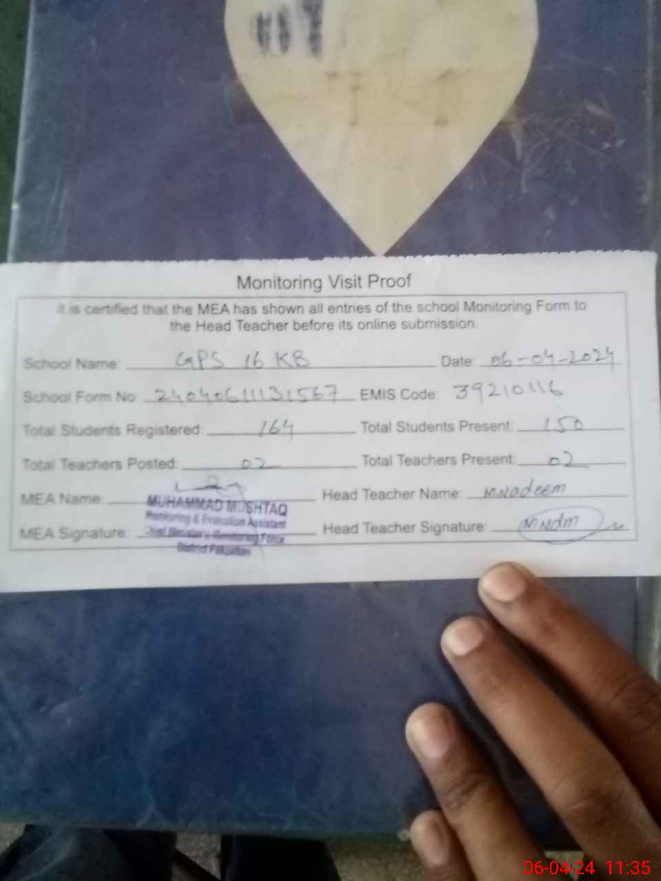 | Attendance Register | Head Teacher | MEA with School | Visit Proof |
