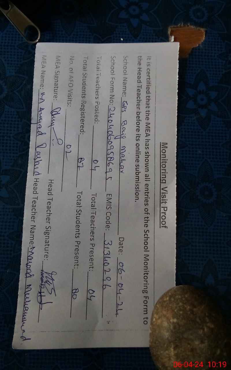 | EMIS Code: 31340296 | Name of School: GPS BAIG MEHAR | |||