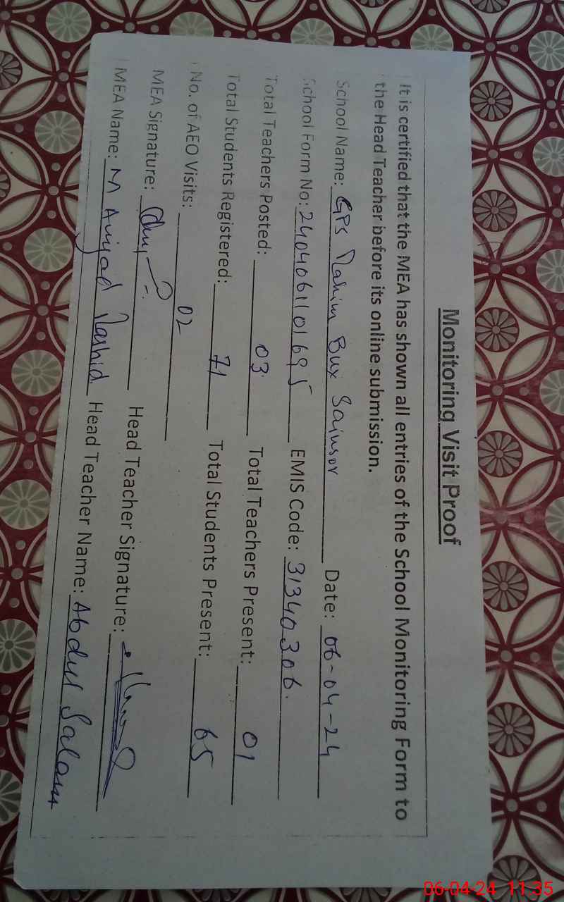 | Certified that this School was Inspected by the Undersigned MEA/DMO Today and the Information Stated Above is as Per Record. | |||||