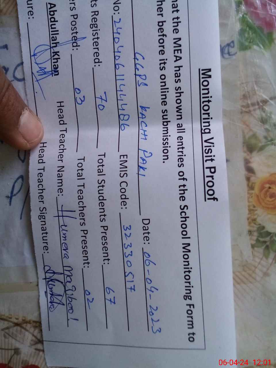 | Attendance Register | Head Teacher | MEA with School | Visit Proof |