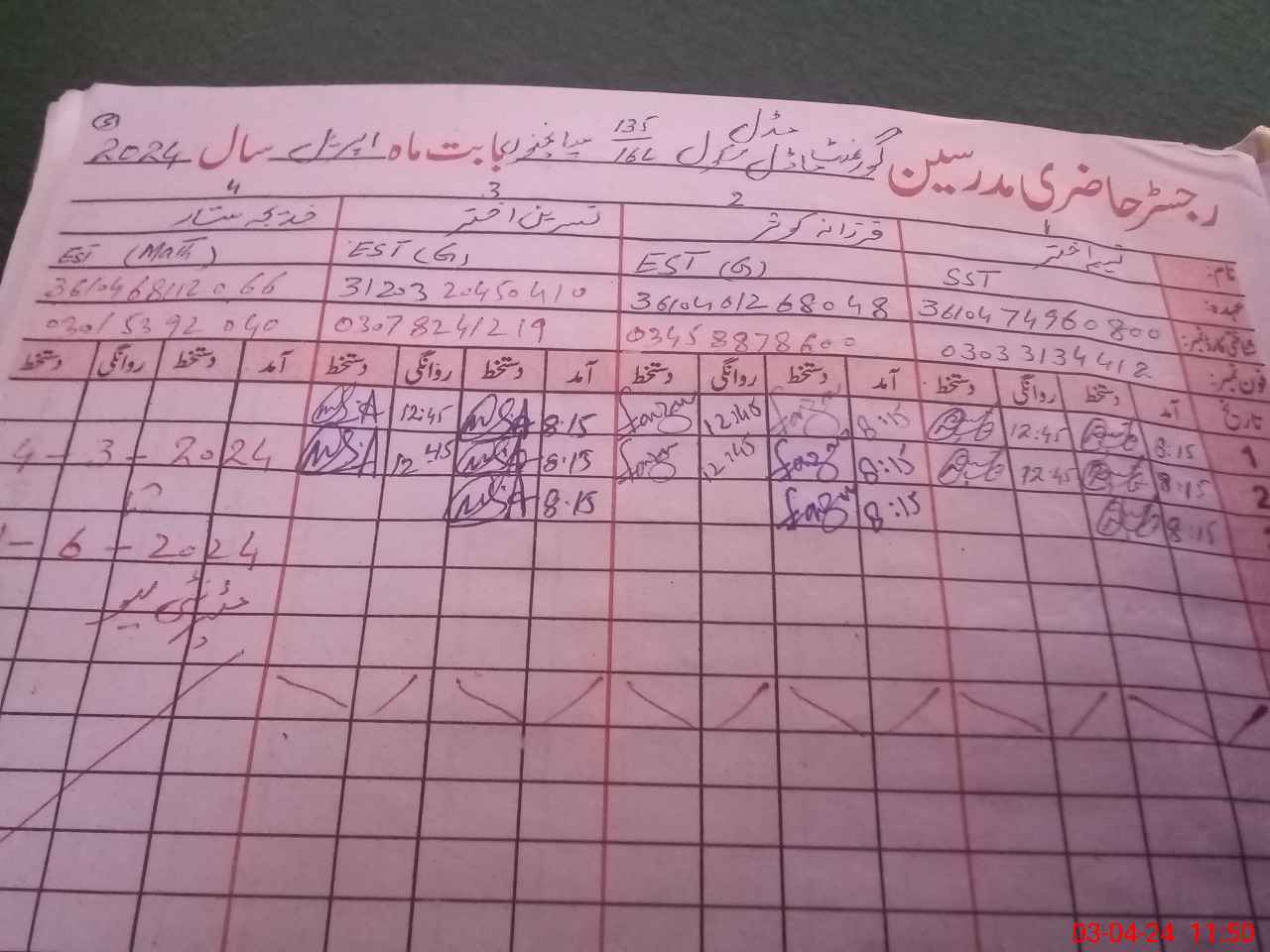 | Name: SH**** AK**** Designation: (School Headmaster's/Headmistress's) S.S.T.(GENERAL) Phone/Cell Number: 03**** |