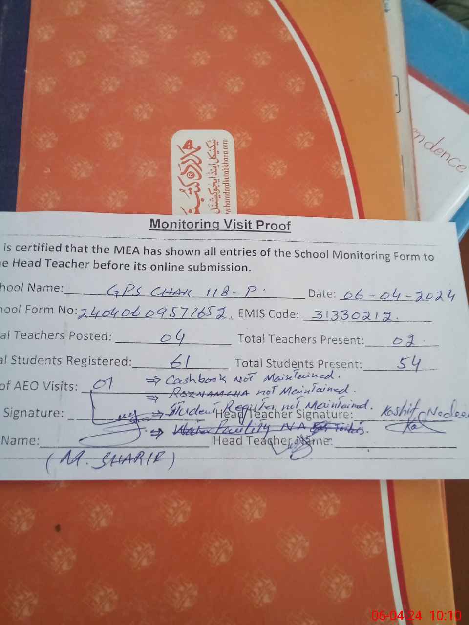 | Remarks (Use Separate Page if Required): NSB cashbook not maintained Raznancha not maintained Students attendance register not maintained Promoted students not entered in SIS Books not received yet Students are without books | |||||