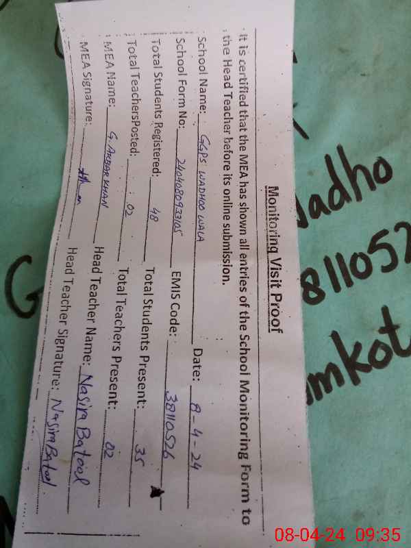 | Certified that this School was Inspected by the Undersigned MEA/DMO Today and the Information Stated Above is as Per Record. | |||||