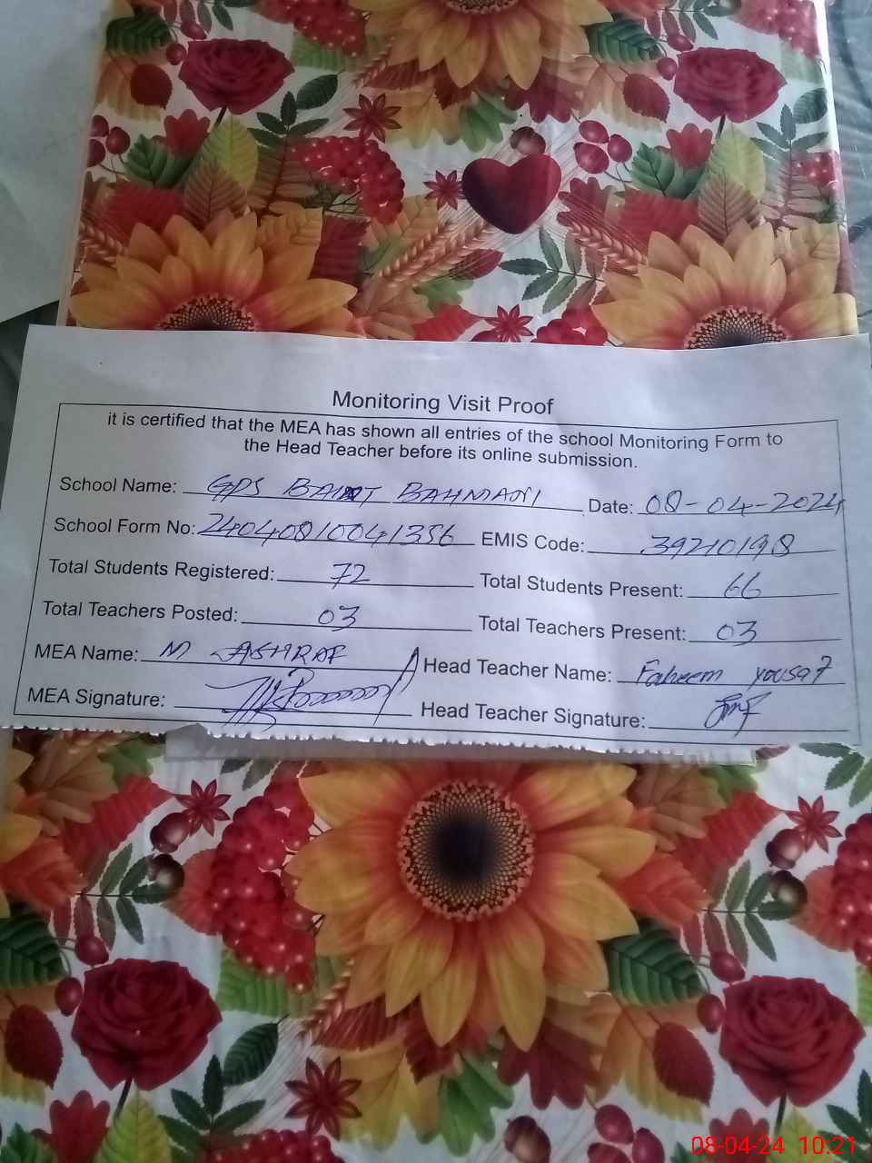 | Attendance Register | Head Teacher | MEA with School | Visit Proof |