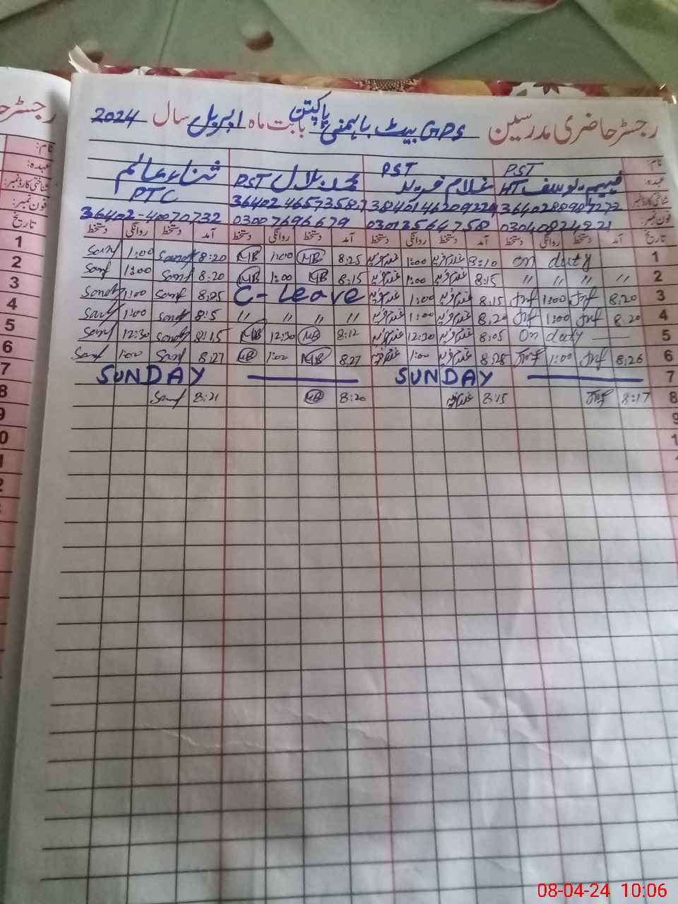| CNIC | Full Name | Designation | R/C | Absence During Last Calender Month |