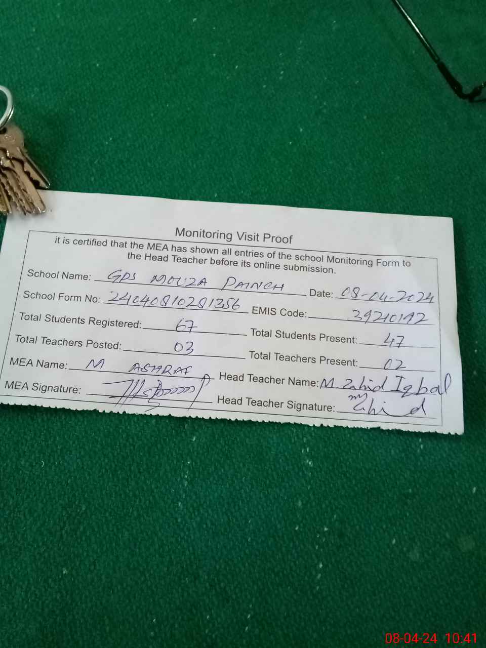 | Attendance Register | Head Teacher | MEA with School | Visit Proof |