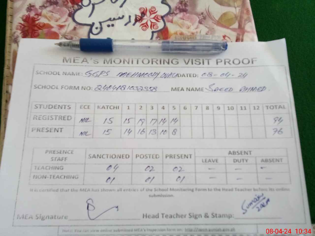| Attendance Register | Head Teacher | MEA with School | Visit Proof |
