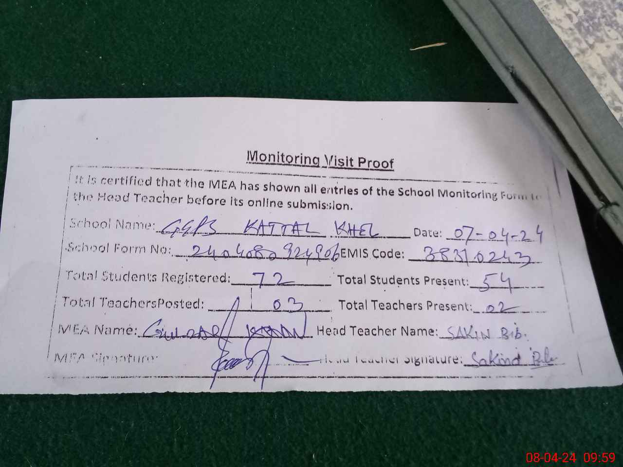 | Attendance Register | Head Teacher | MEA with School | Visit Proof |