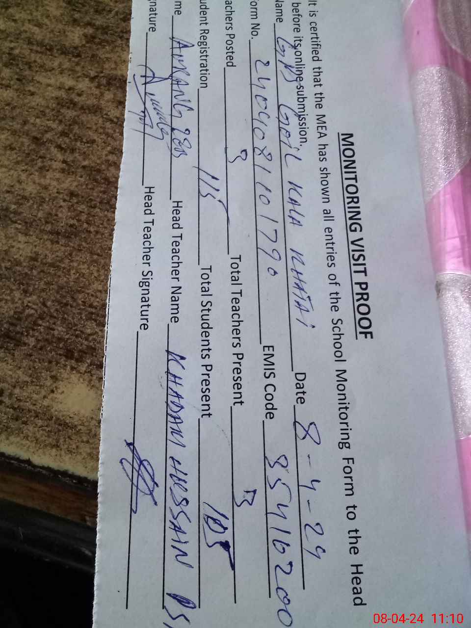 | Name: Kh**** Hu**** Designation: (School Headmaster's/Headmistress's) PST Phone/Cell Number: 03**** |