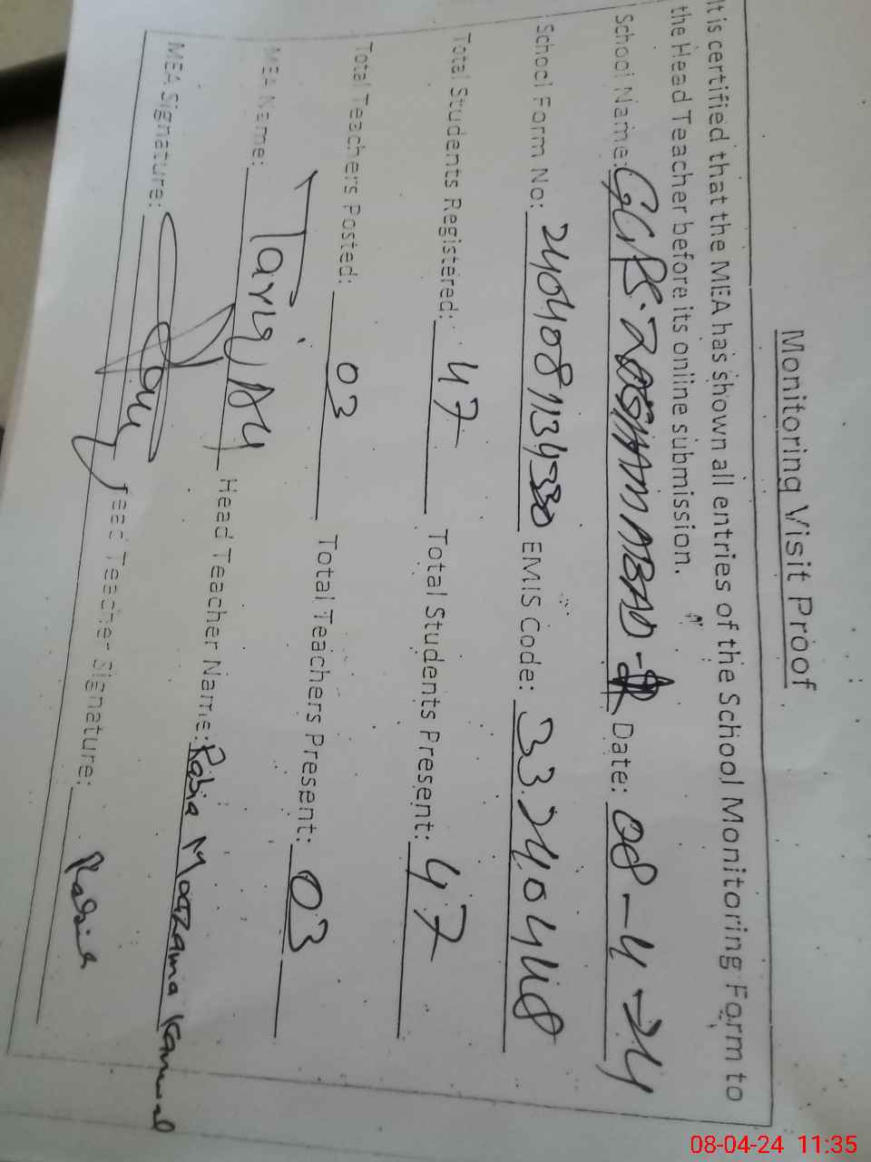 | Certified that this School was Inspected by the Undersigned MEA/DMO Today and the Information Stated Above is as Per Record. | |||||