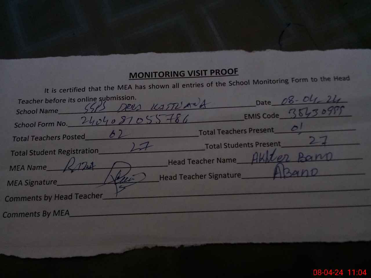 | Attendance Register | Head Teacher | MEA with School | Visit Proof |