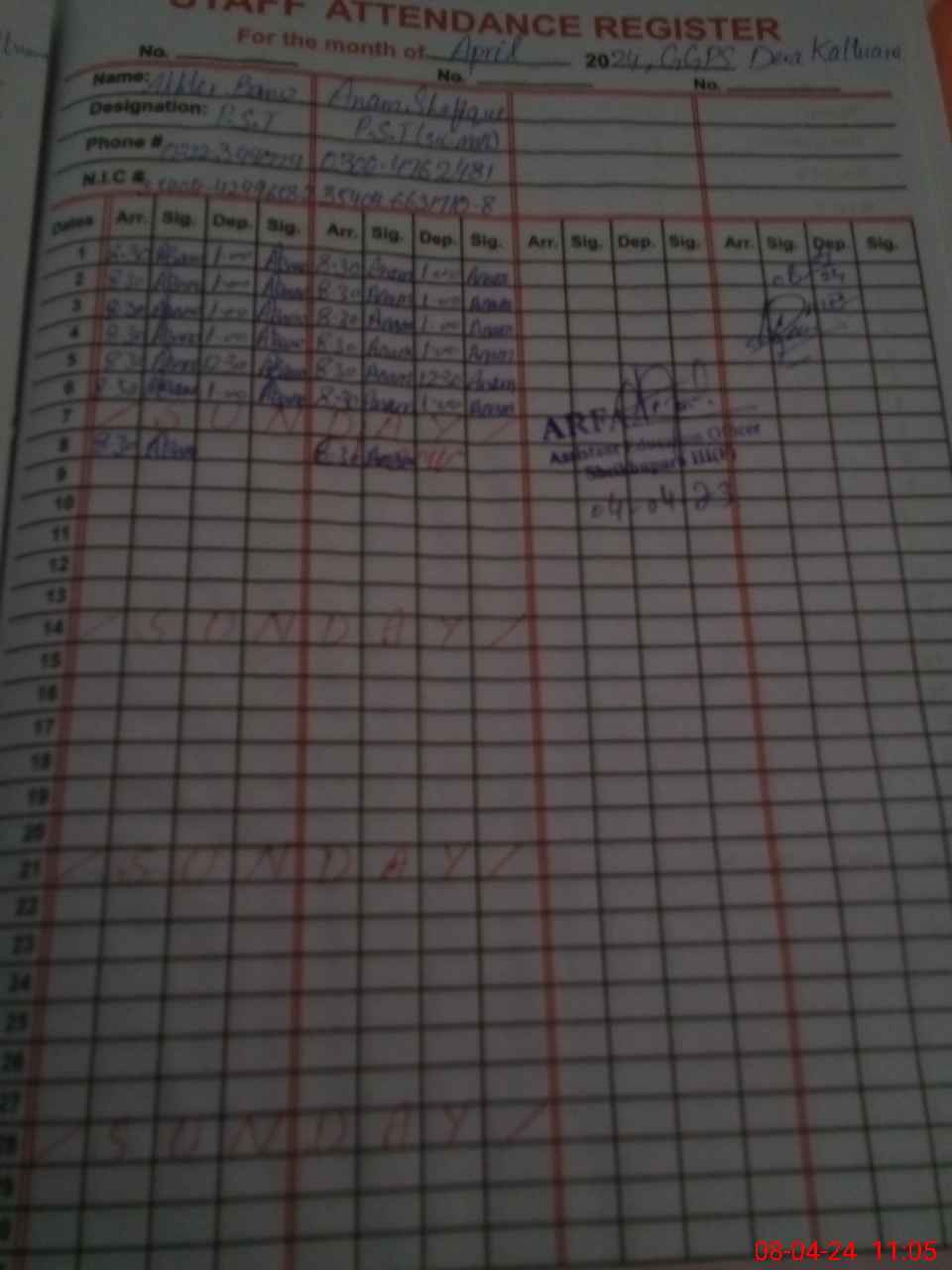 | Name: An**** Sh**** Designation: (School Headmaster's/Headmistress's) PST Phone/Cell Number: 03**** |
