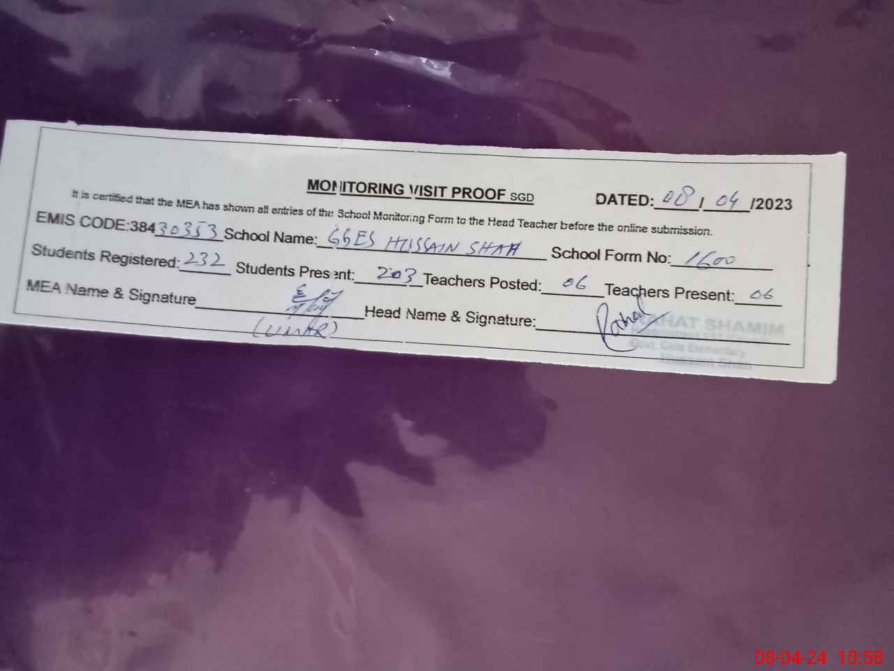 | Attendance Register | Head Teacher | MEA with School | Visit Proof |