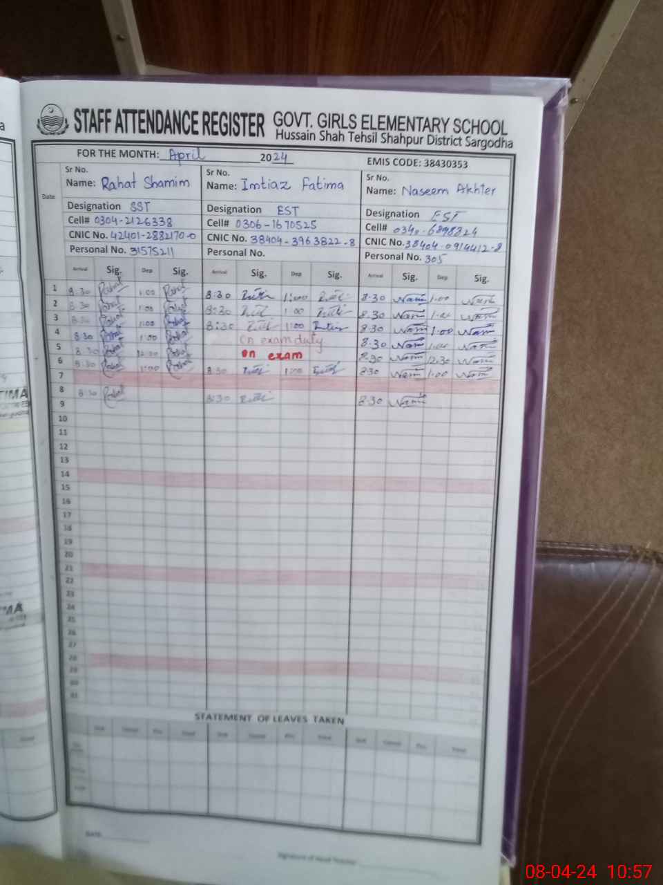 | CNIC | Full Name | Designation | R/C | Absence During Last Calender Month |