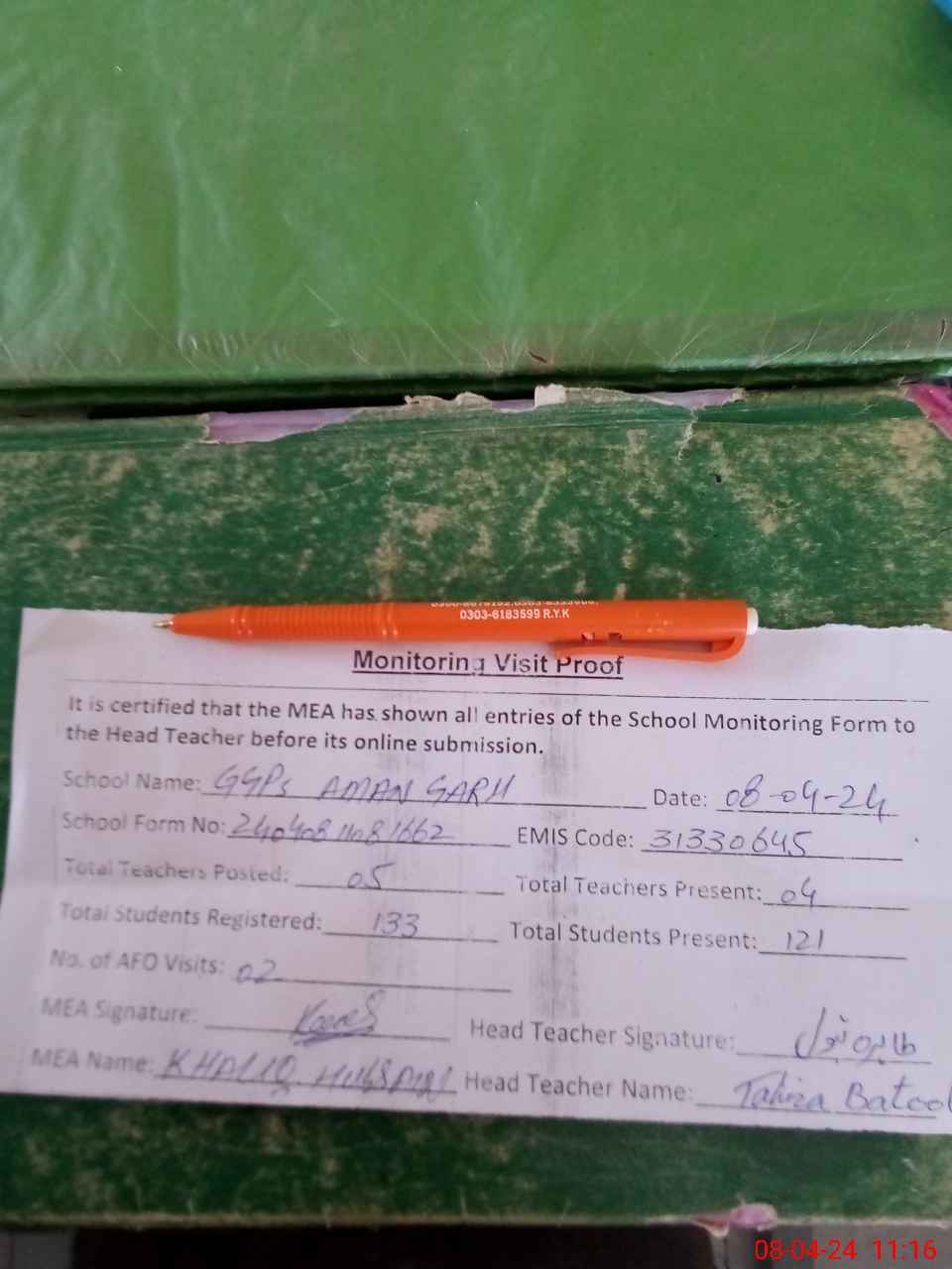 | Attendance Register | Head Teacher | MEA with School | Visit Proof |