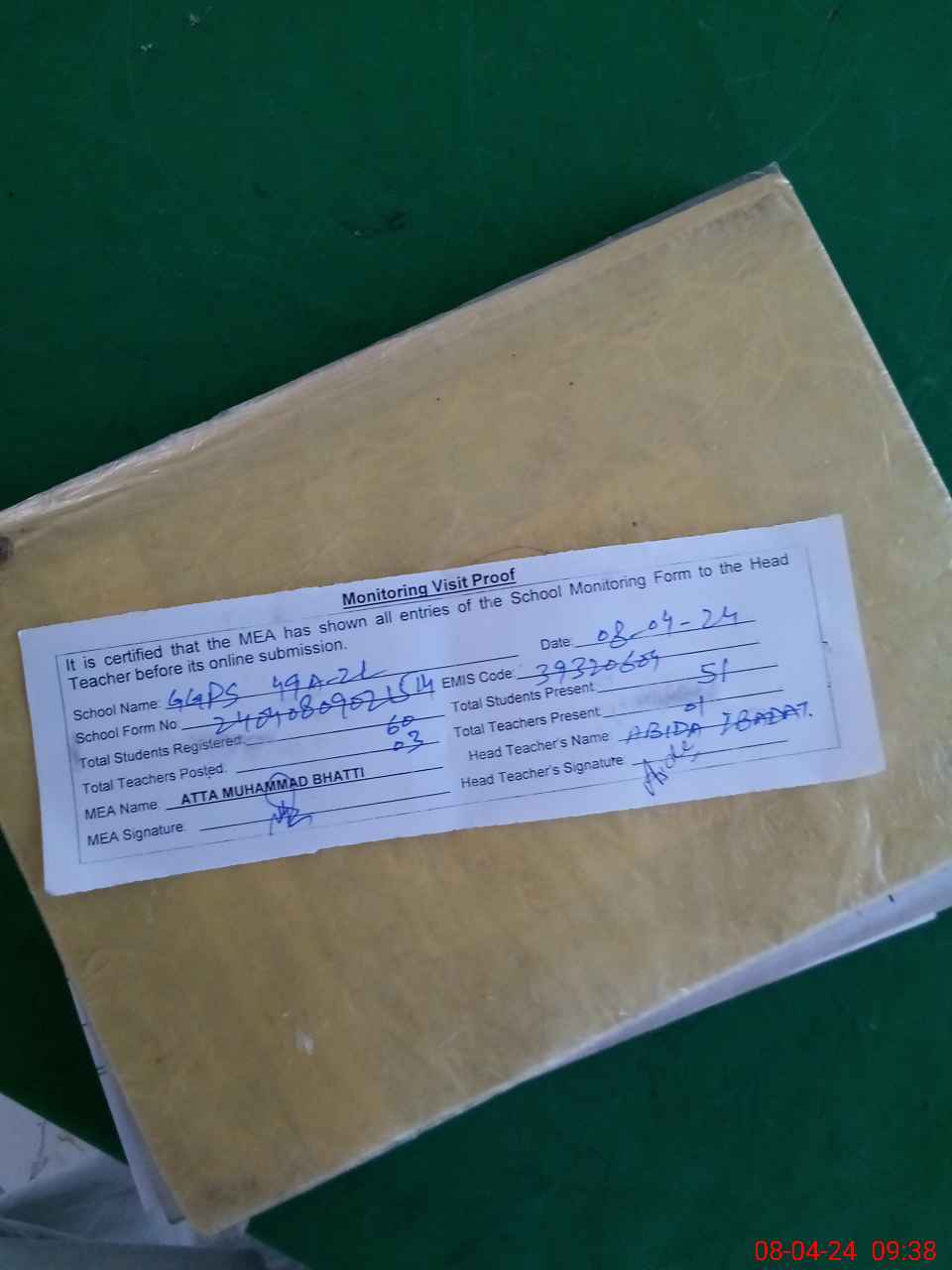 | Attendance Register | Head Teacher | MEA with School | Visit Proof |