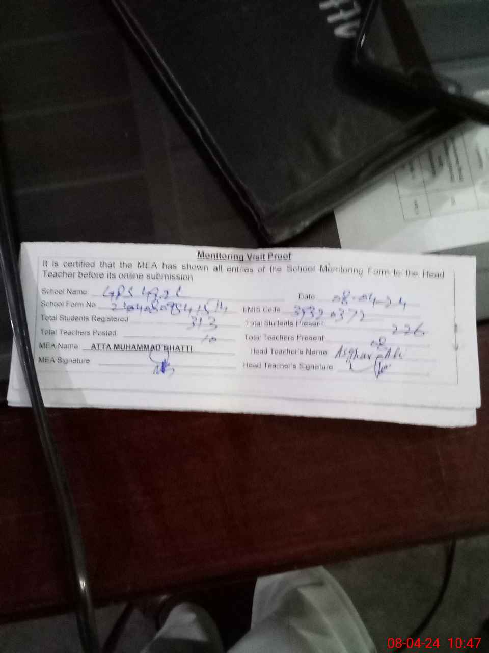 | Attendance Register | Head Teacher | MEA with School | Visit Proof |