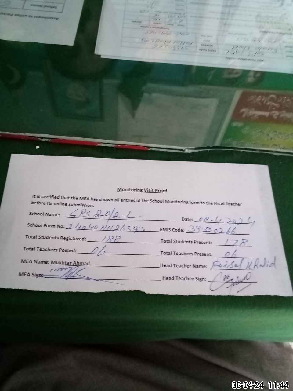 | Attendance Register | Head Teacher | MEA with School | Visit Proof |