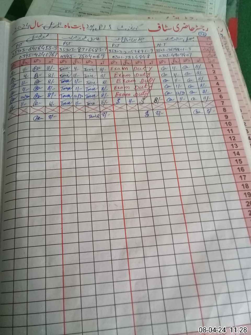 | CNIC | Full Name | Designation | R/C | Absence During Last Calender Month |