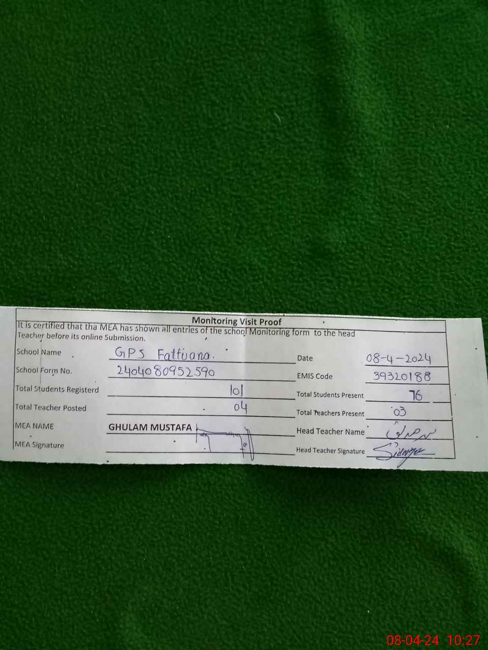 | Remarks (Use Separate Page if Required): Nominal roll for online attendance found contrary to the available record at school The school found well maintained Submitted please | |||||