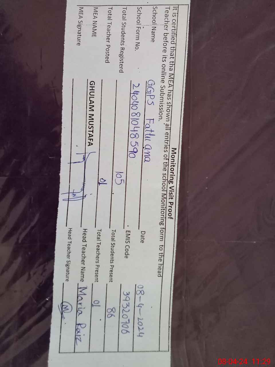 | Attendance Register | Head Teacher | MEA with School | Visit Proof |