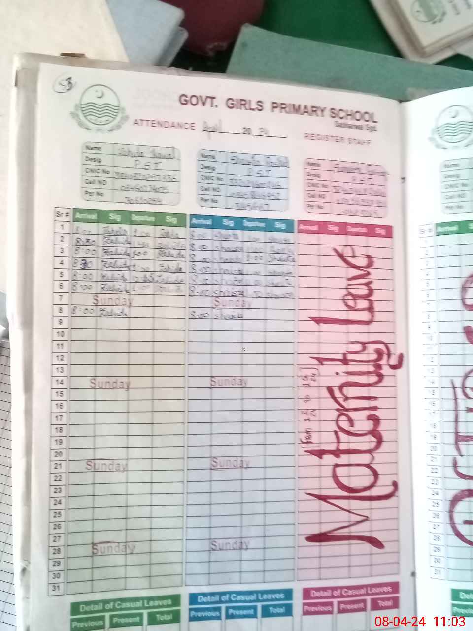 | Leave | Duty | Absent | Maternity | Medical | Ex- Pak |