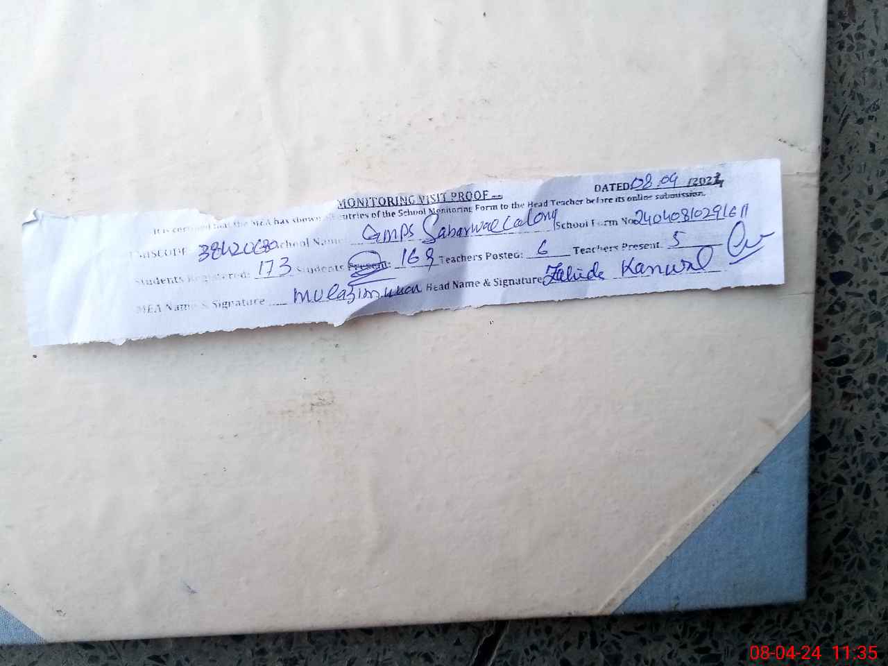 | Attendance Register | Head Teacher | MEA with School | Visit Proof |