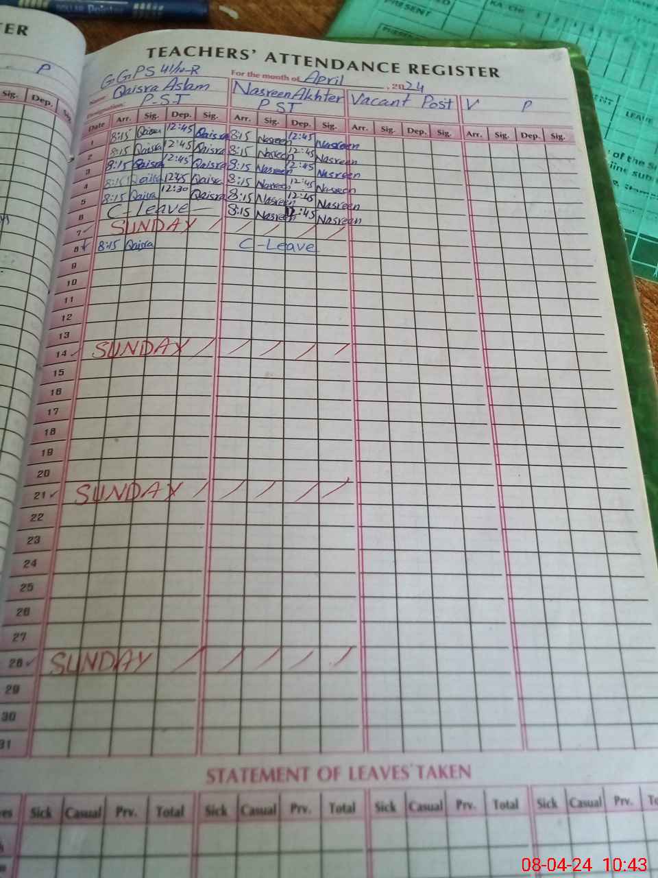 | Leave | Duty | Absent | Maternity | Medical | Ex- Pak |