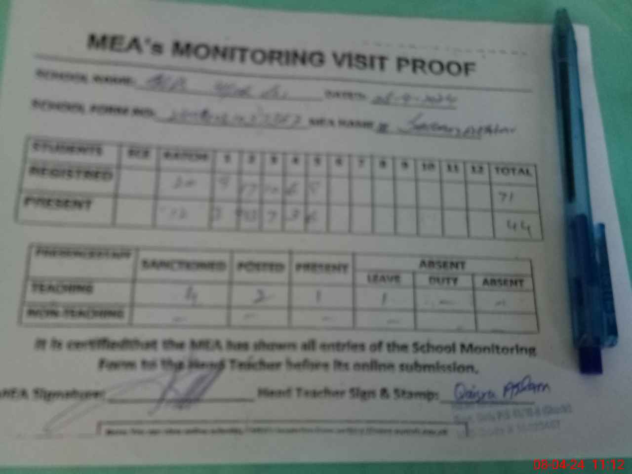 | Attendance Register | Head Teacher | MEA with School | Visit Proof |