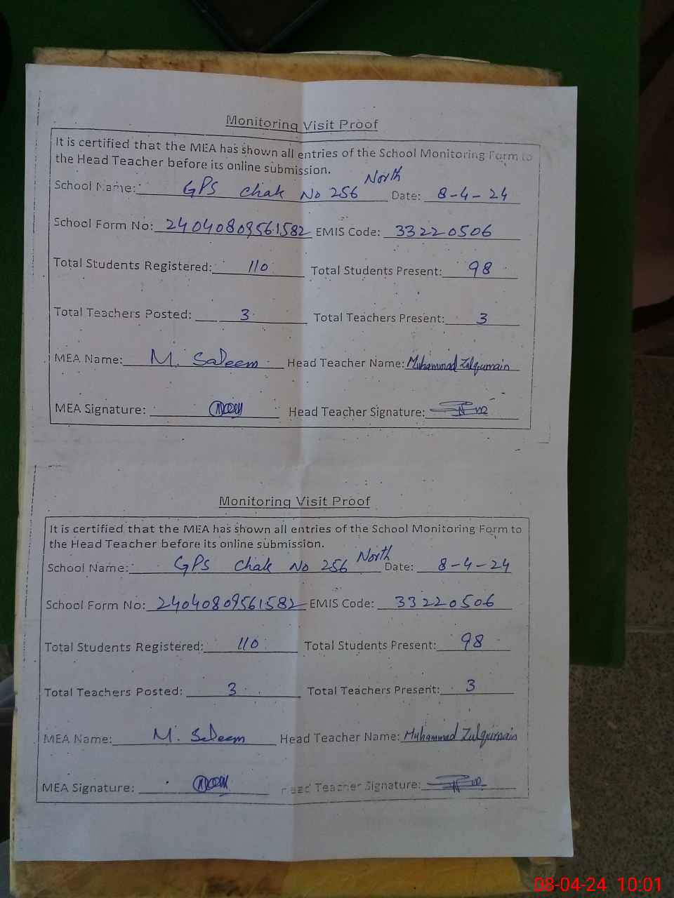 | EMIS Code: 33220506 | Name of School: GPS CHAK NO 256 JB NORTH | |||