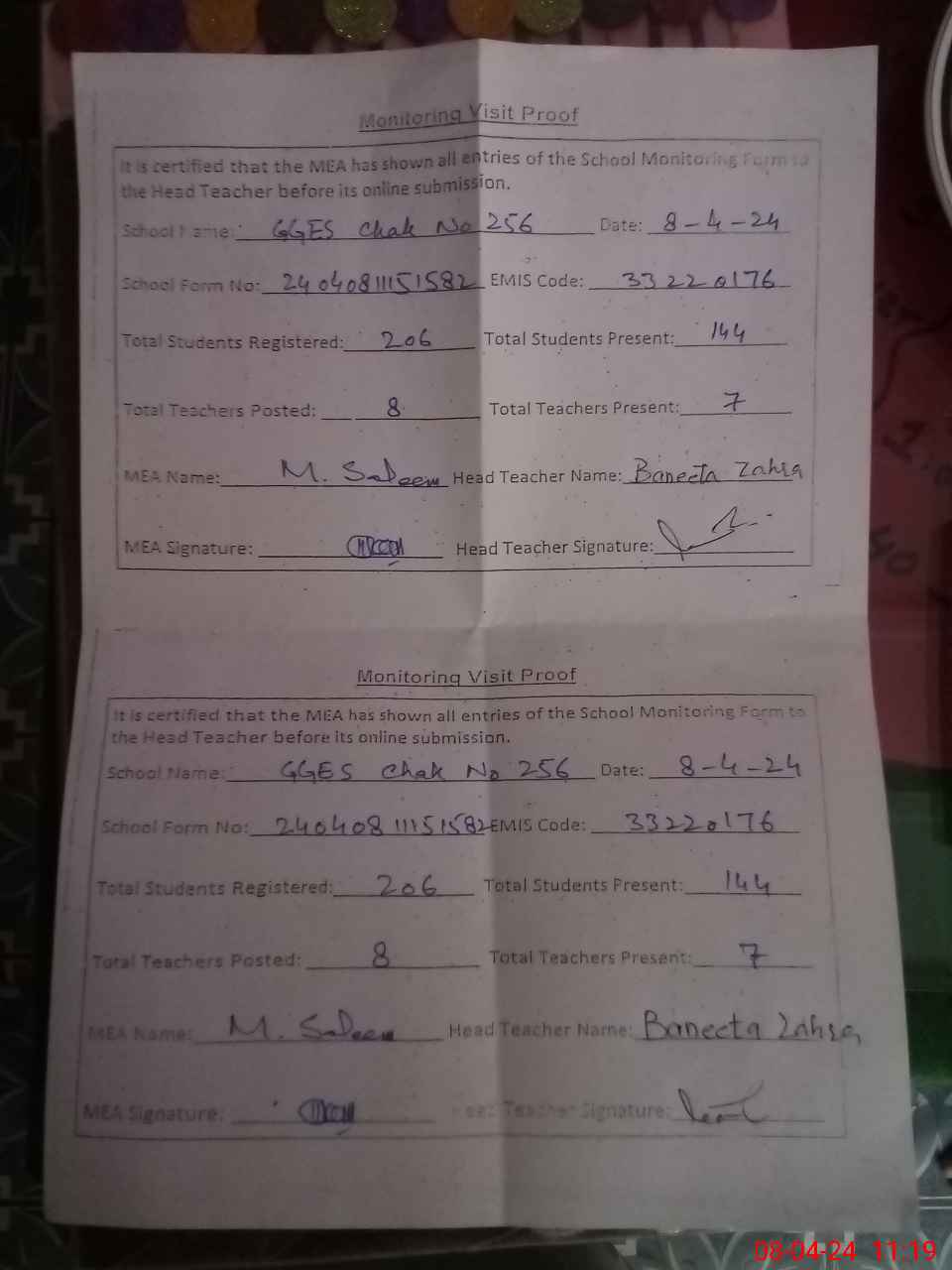 | Attendance Register | Head Teacher | MEA with School | Visit Proof |