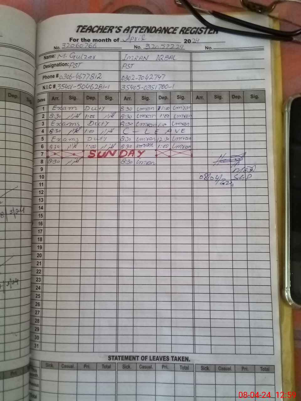 | CNIC | Full Name | Designation | R/C | Absence During Last Calender Month |