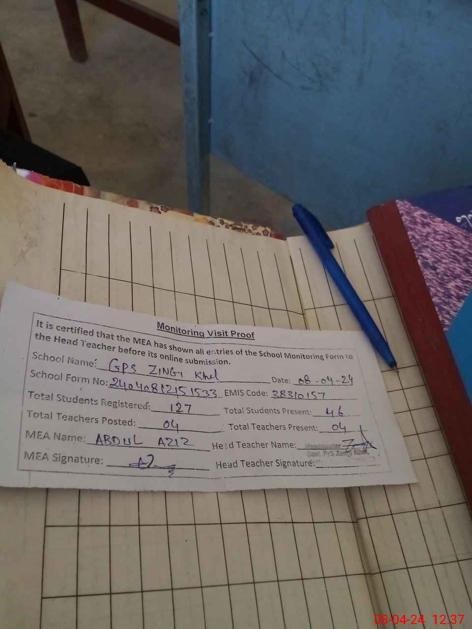 | Attendance Register | Head Teacher | MEA with School | Visit Proof |