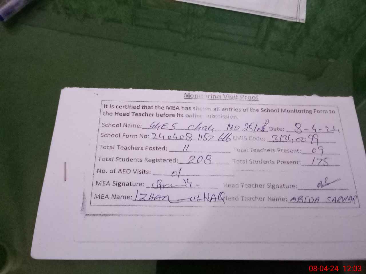 | Attendance Register | Head Teacher | MEA with School | Visit Proof |
