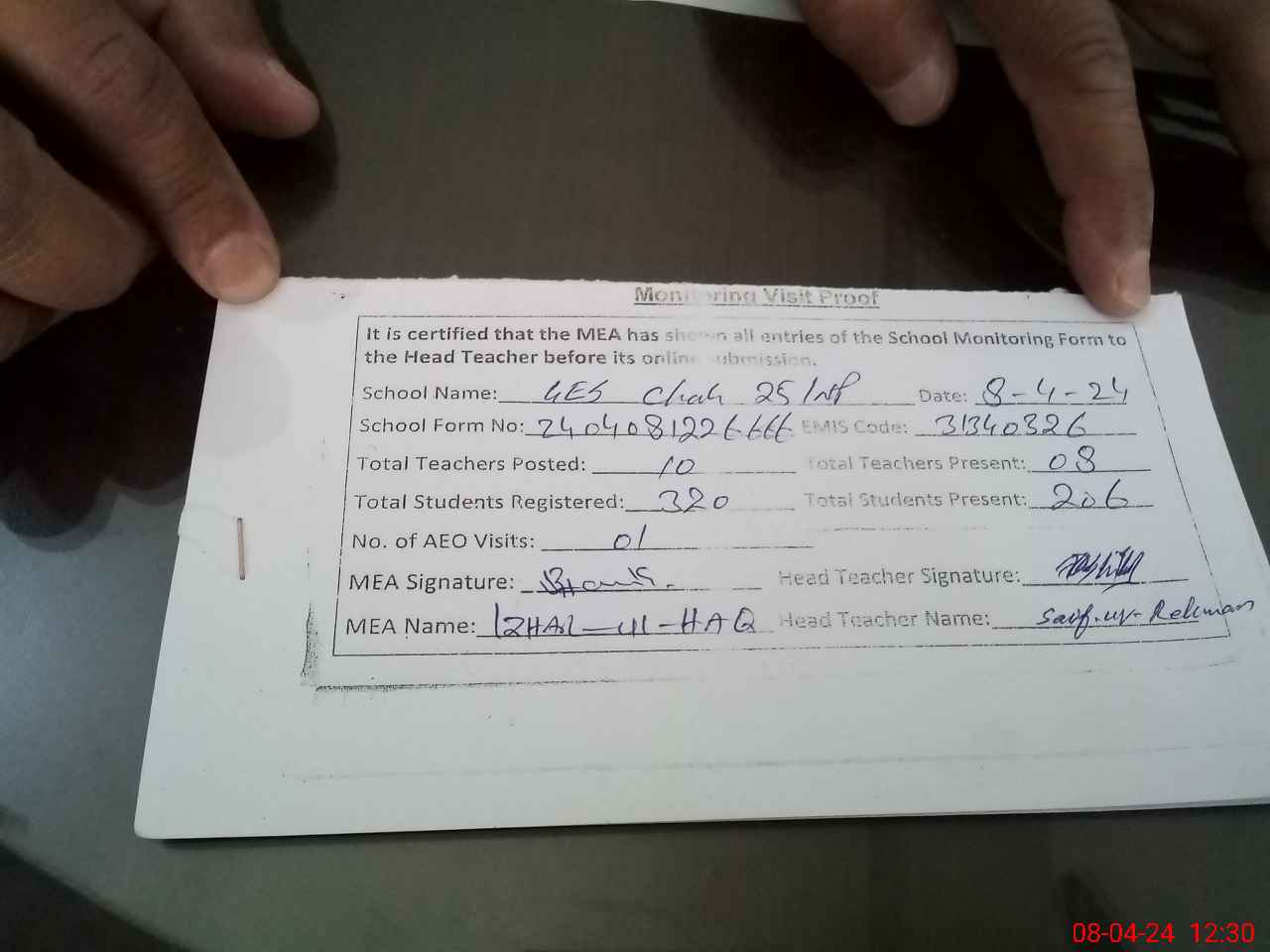 | Attendance Register | Head Teacher | MEA with School | Visit Proof |