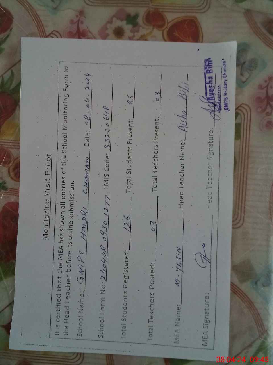 | Attendance Register | Head Teacher | MEA with School | Visit Proof |