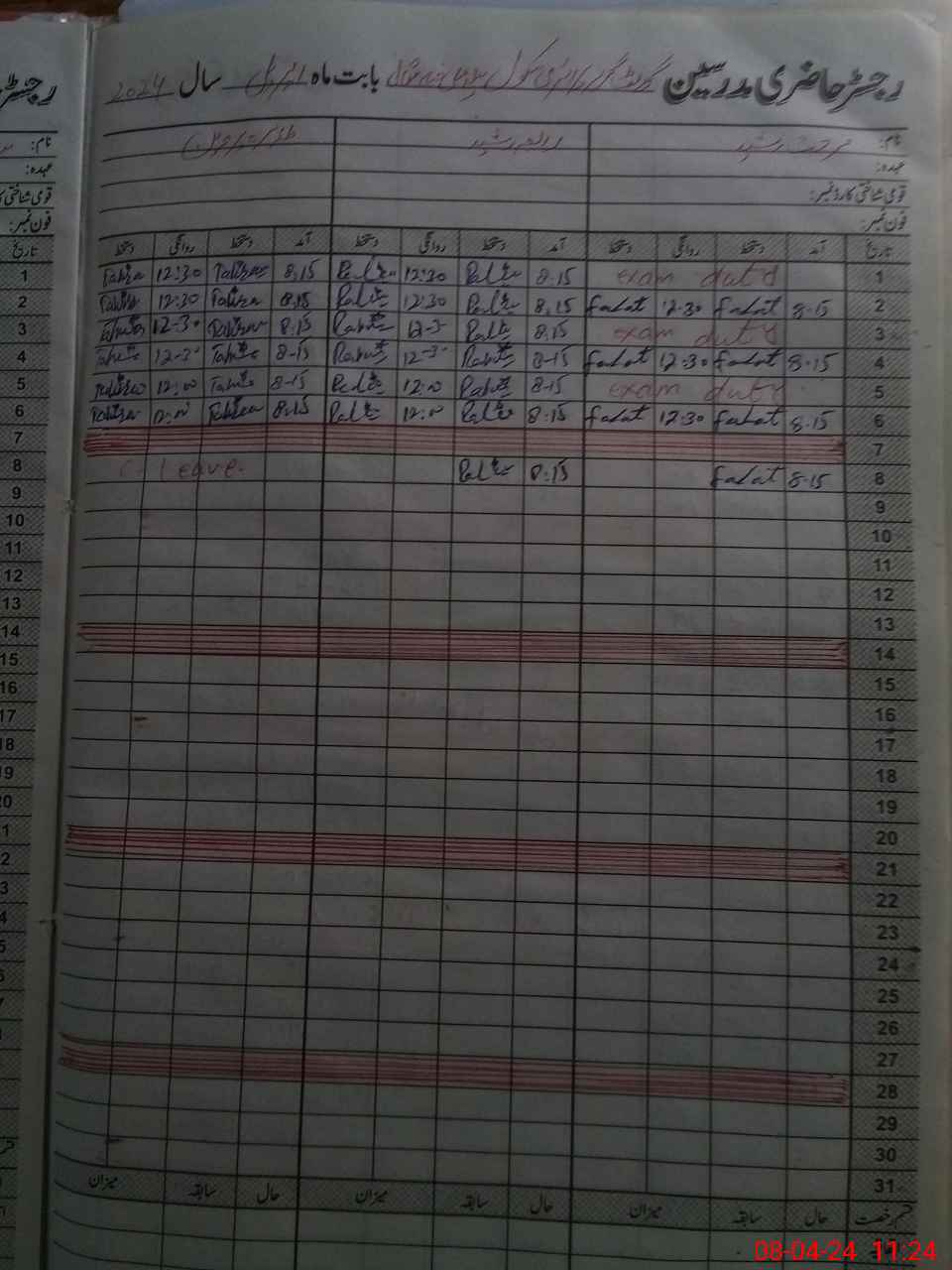 | CNIC | Full Name | Designation | R/C | Absence During Last Calender Month |
