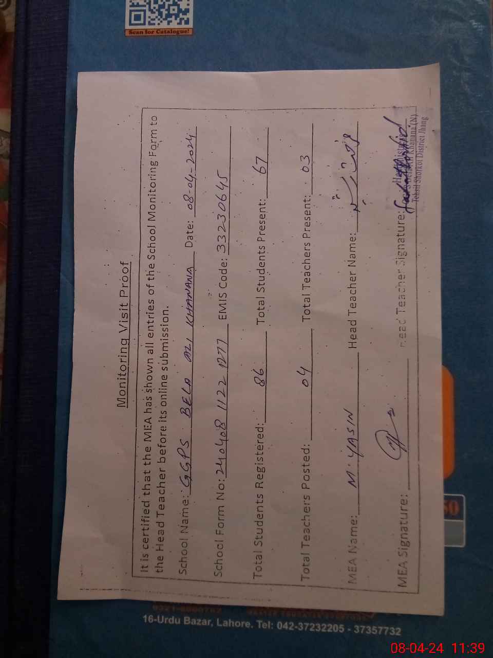 | Attendance Register | Head Teacher | MEA with School | Visit Proof |