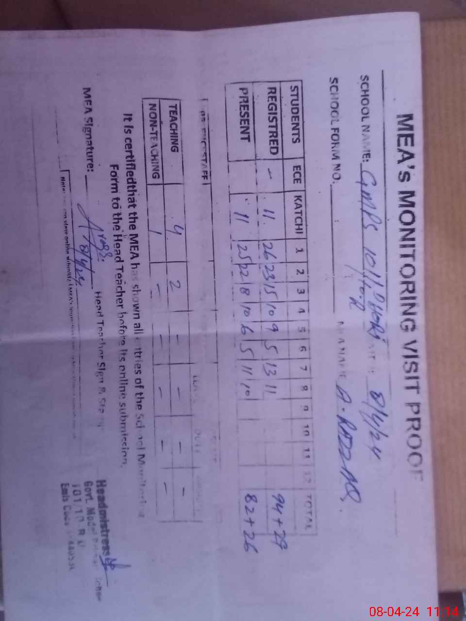 | Attendance Register | Head Teacher | MEA with School | Visit Proof |