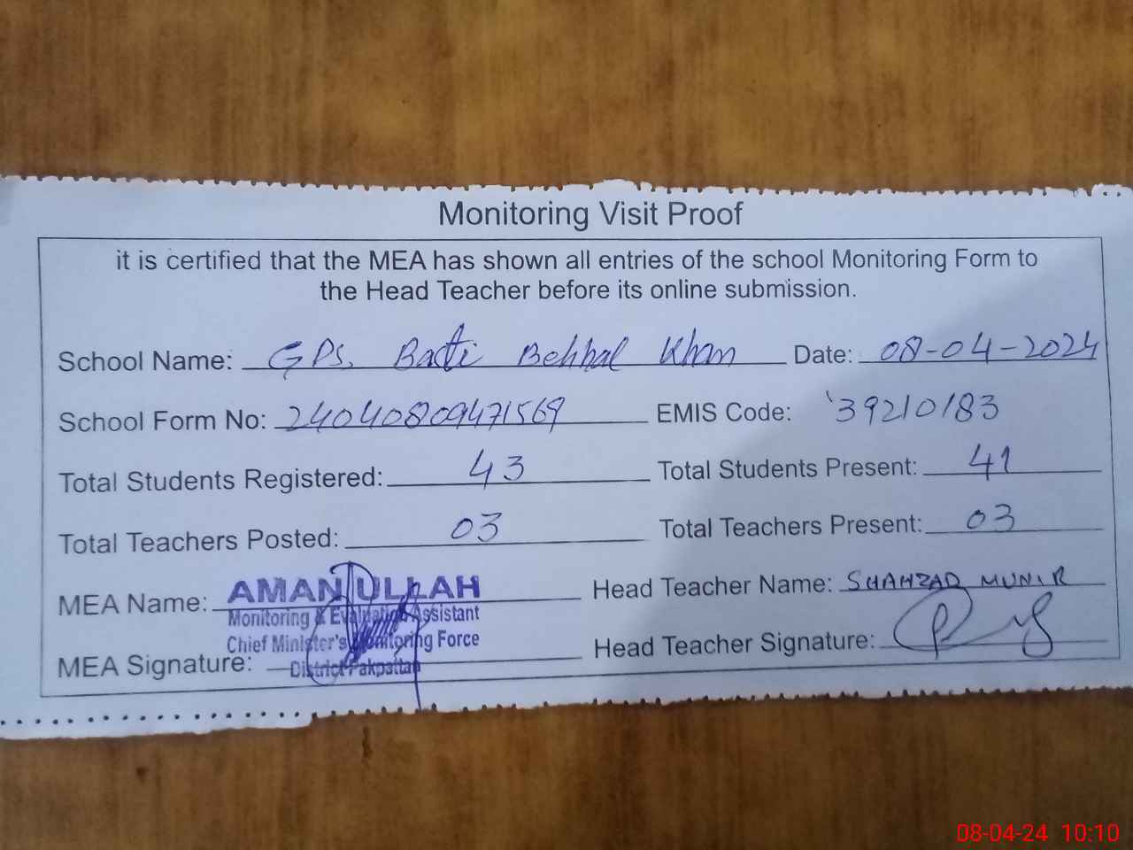 | Monitoring Date: 08-04-2024 | Start Time: 08-04-2024 09:47 AM | End Time: 08-04-2024 10:32 AM | Name of MEA: AM**** UL**** | |