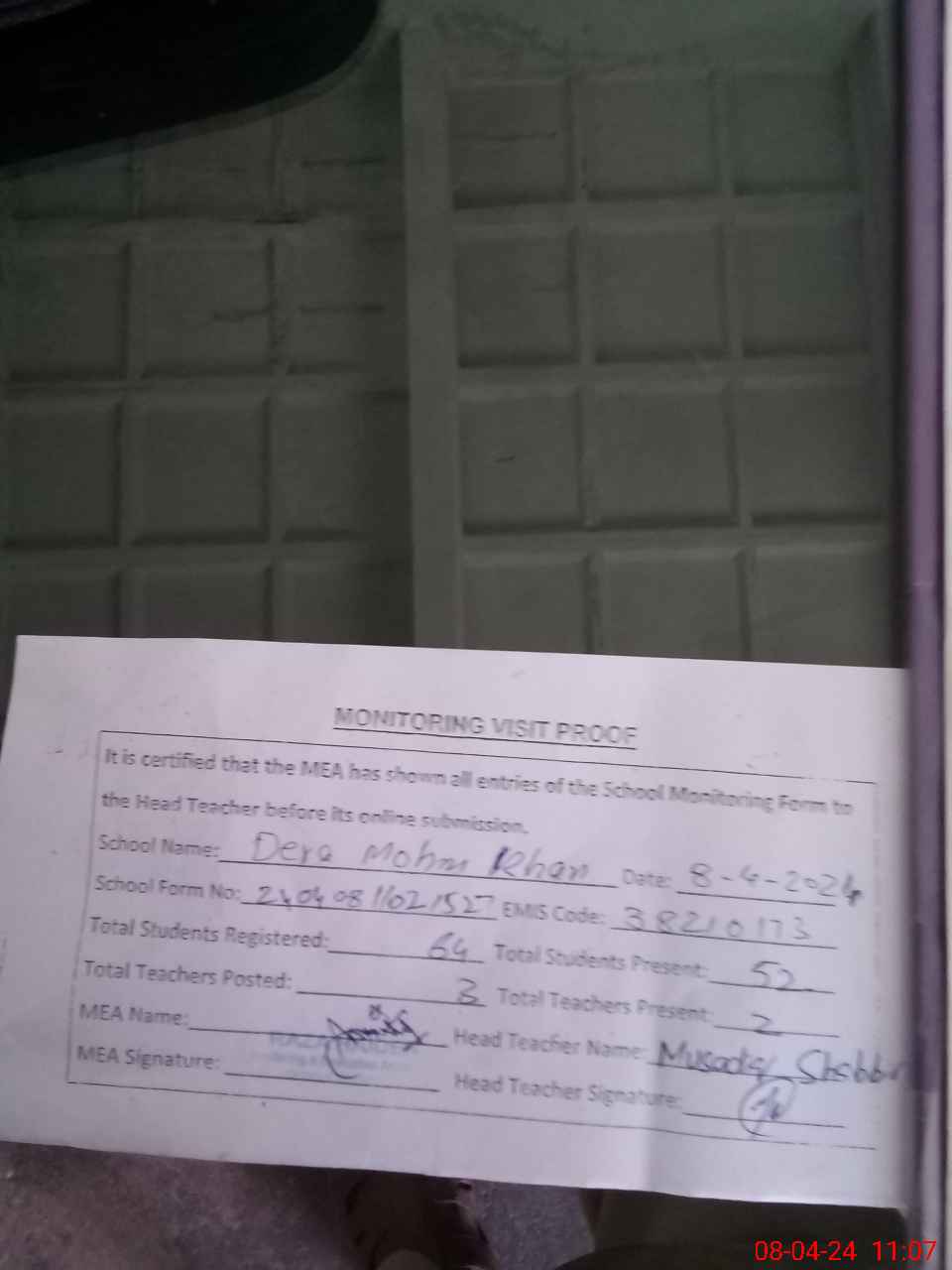 | Attendance Register | Head Teacher | MEA with School | Visit Proof |