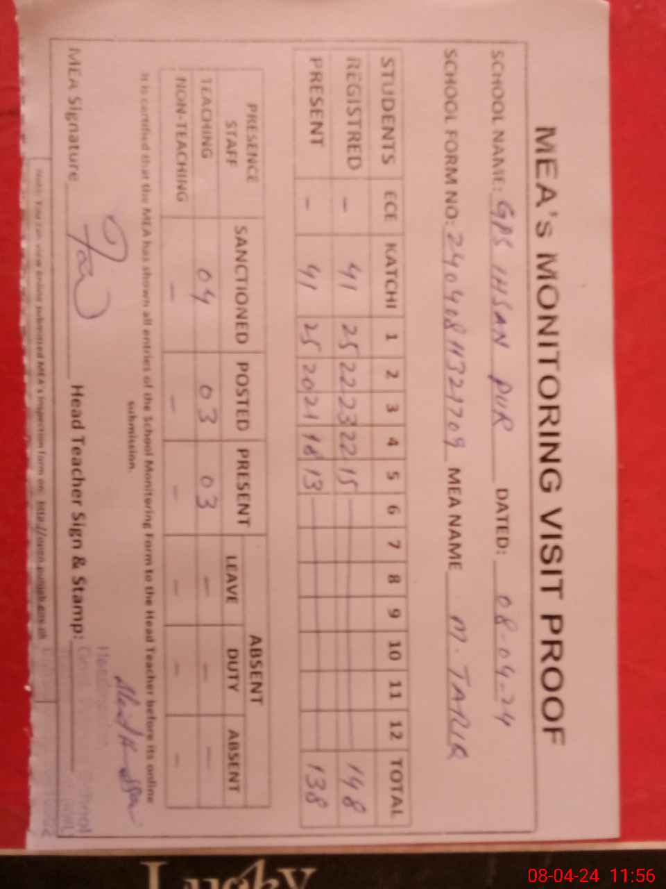 | Attendance Register | Head Teacher | MEA with School | Visit Proof |