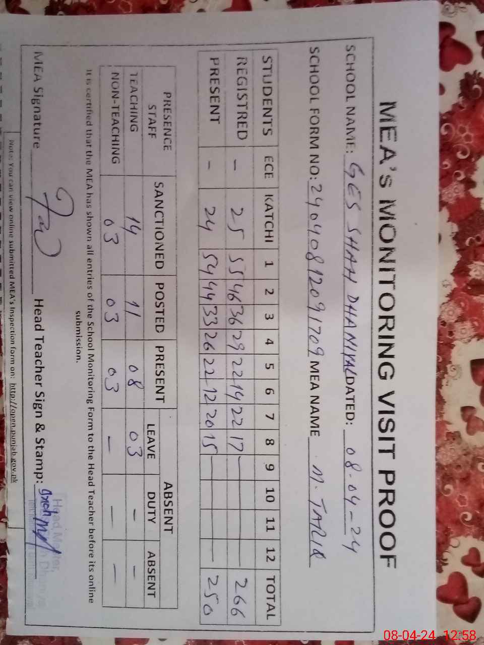 | Attendance Register | Head Teacher | MEA with School | Visit Proof |