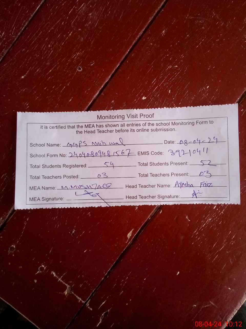 | Attendance Register | Head Teacher | MEA with School | Visit Proof |